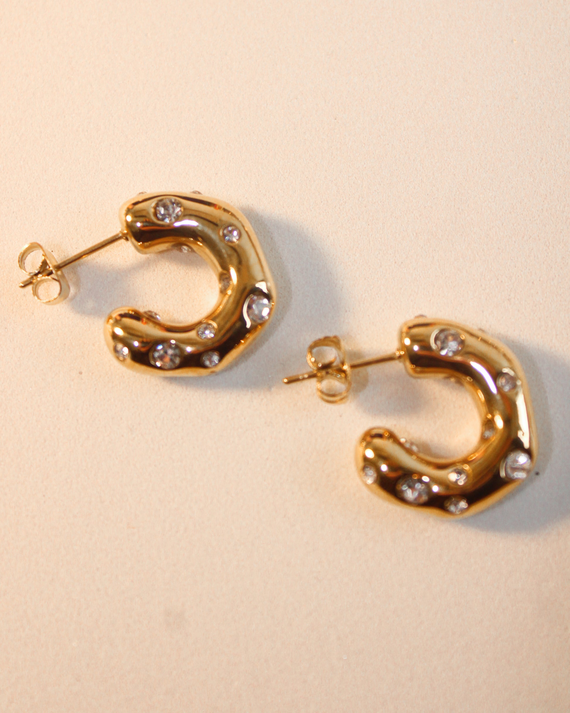 | Aros de acero inoxidable enchapado en oro. Con su forma irregular y zircones pasara a ser uno de tus favoritos en tu joyero. |