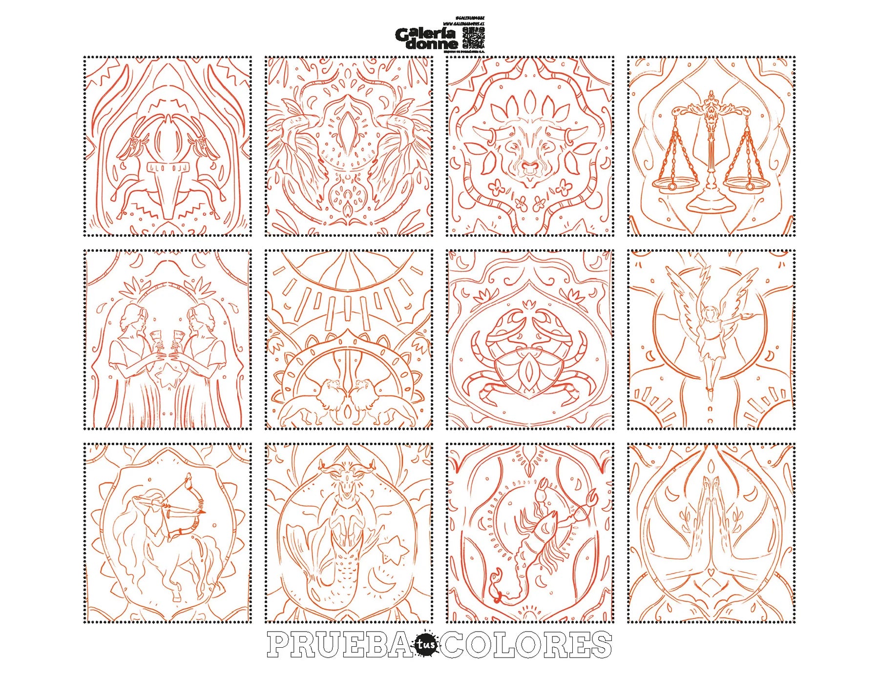 Constelaciones contiene 12 ilustraciones dobles de los signos zodiacales, cada página de 240 gramos con prepicado.