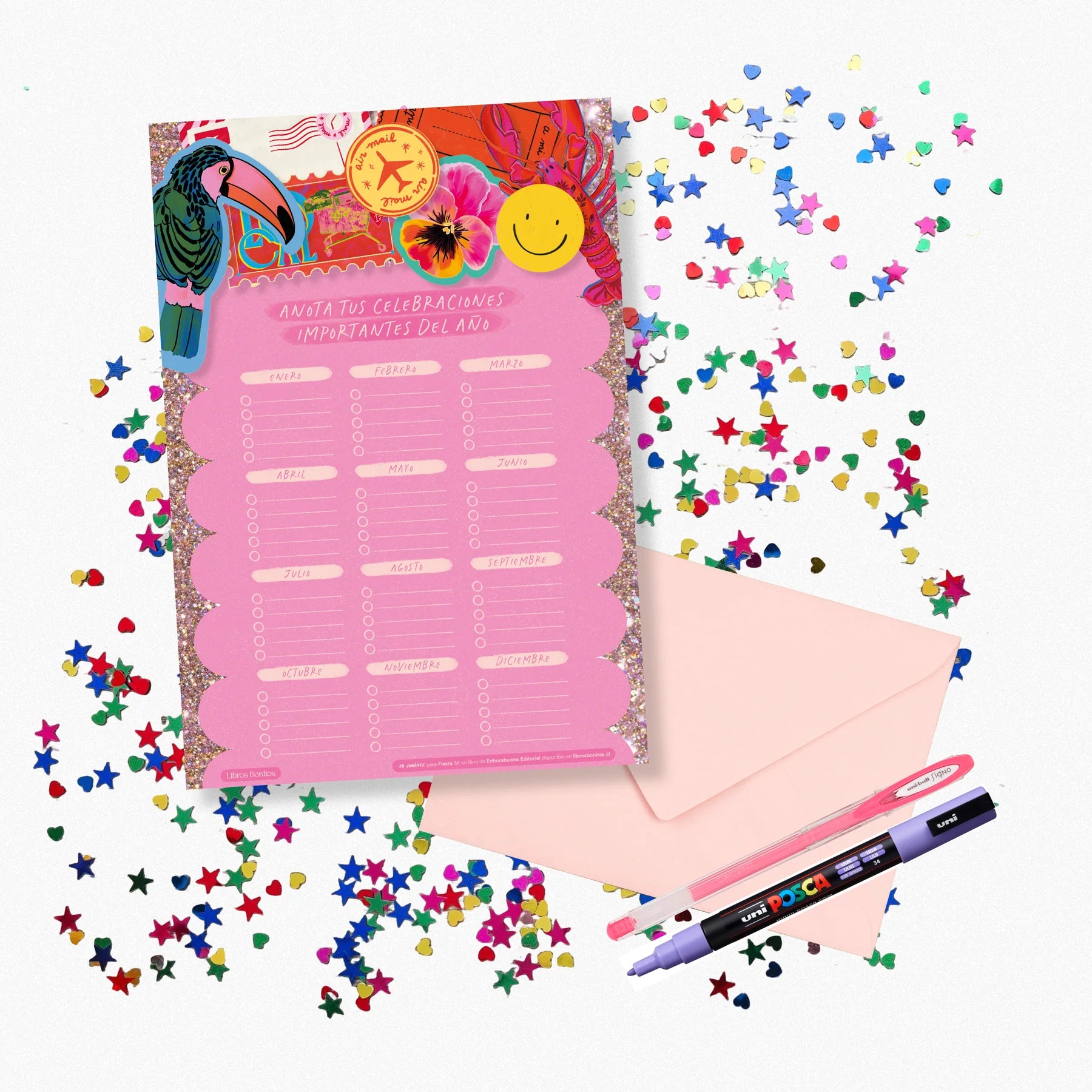 El primer libro de la artista visual e ilustradora chilena Jo Jiménez es un compilado de recuerdos e historias que nos invitan a llenar de brillo y color los distintos momentos de la vida. Fiesta 30 es un libro para armar y desarmar, para hacer, jugar, pintar, bordar, tejer y crear.