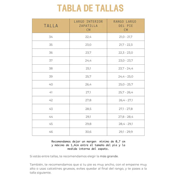 Ojo! Nuestra horma es pequeña, es posible que seas un número más del que usas habitualmente. Revisa la tabla de tallas